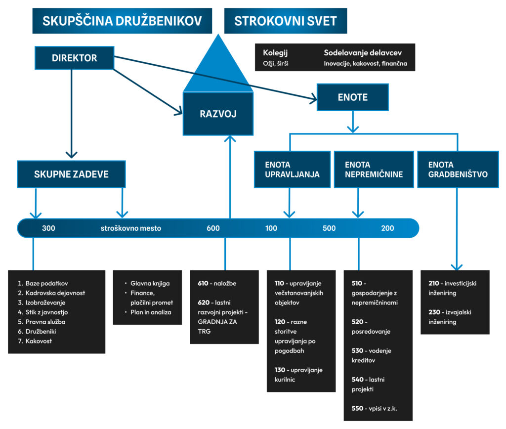 Kot je razvidno iz organizacijske sheme je vsa dejavnost podjetja usmerjena v zagotavljanje lastnikom nepremičnin varno, kakovostno ter zakonsko skladno storitev, ki jo v podjetju izvajamo tako da: